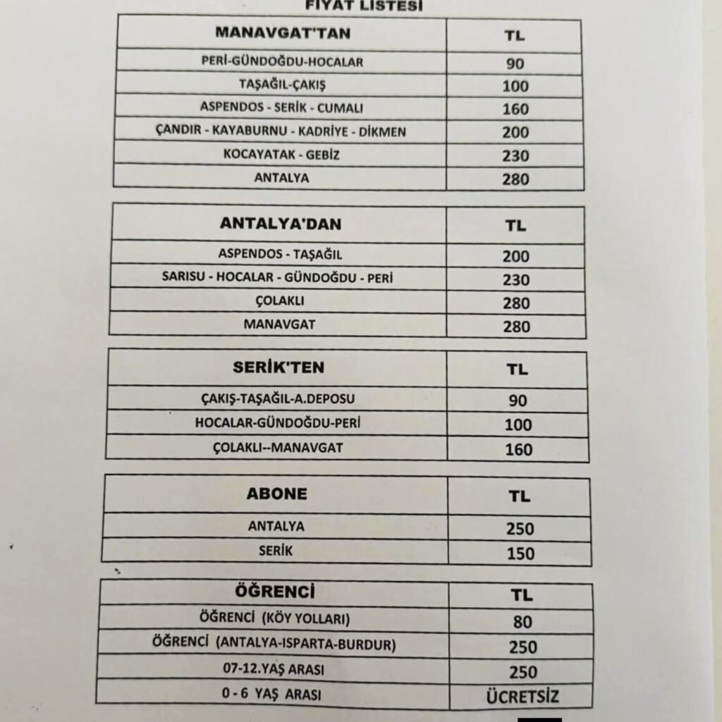 Yeni düzenlemeye göre şehir içi indi-bindi 42 TL olurken Manavgat’tan Antalya yolculuk ücreti de 280 TL’ye yükseldi.